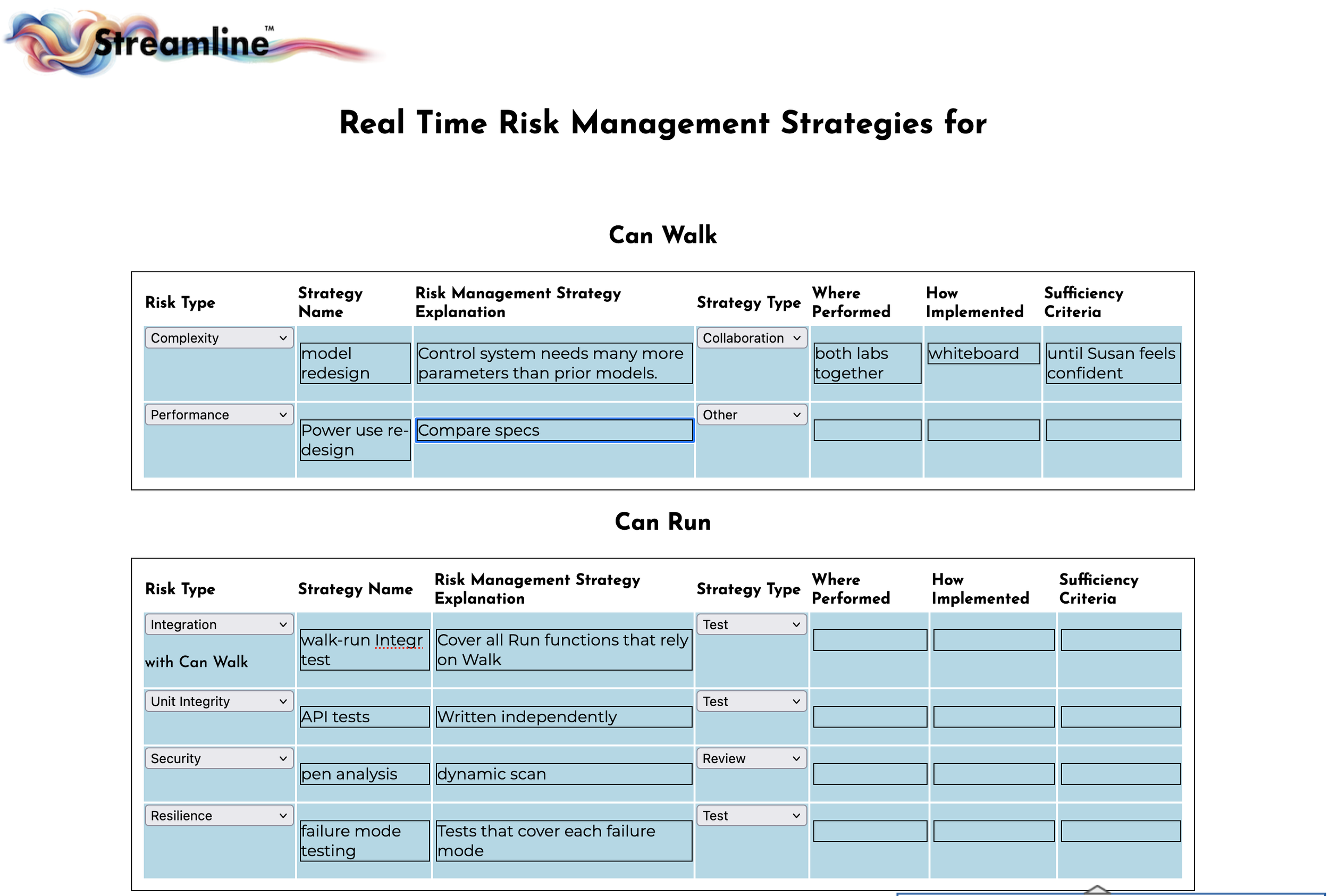 The panel provides a pull-down menu for different types of risk, in order to prompt the user to consider those types. It has a similar pull-down for mitigation strategies. The nature of the options in the latter pull-down is that they are all real-time oriented. We’ll explain that momentarily.