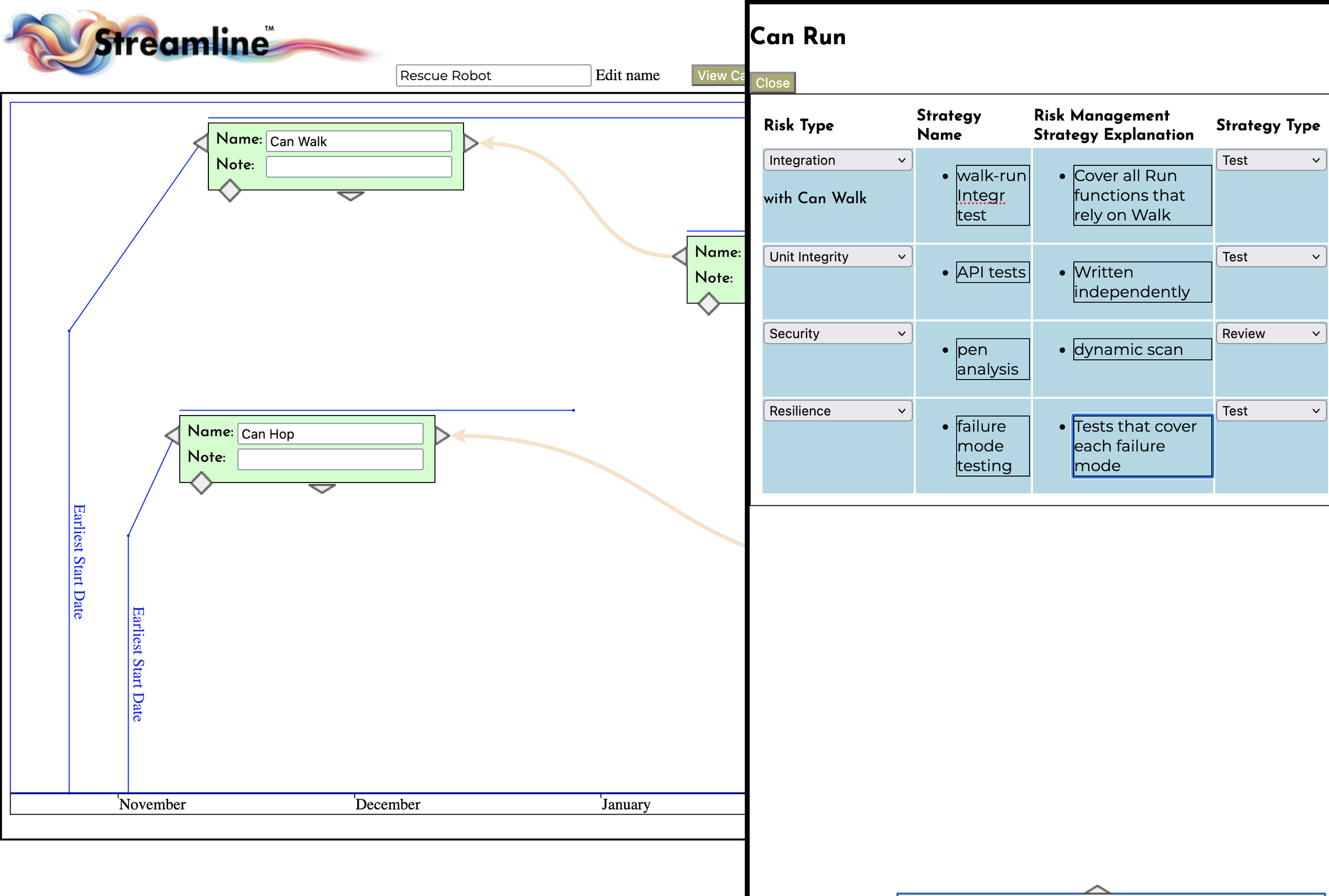 Streamline’s primary planning view is the Roadmap view. It graphically depicts the major things you are trying to create. We call them capabilities. In the example we often use, the project is about designing a robot product that can be used for search-and-rescue. The simplistic roadmap for that consists of five capabilities: Walk, Hop, Run, Jump, and Skip. The Run capability depends on the Walk capability (see the gold arrow between them), in the sense that Run will build on the Walk capability. Here’s a closeup view of the capabilities: