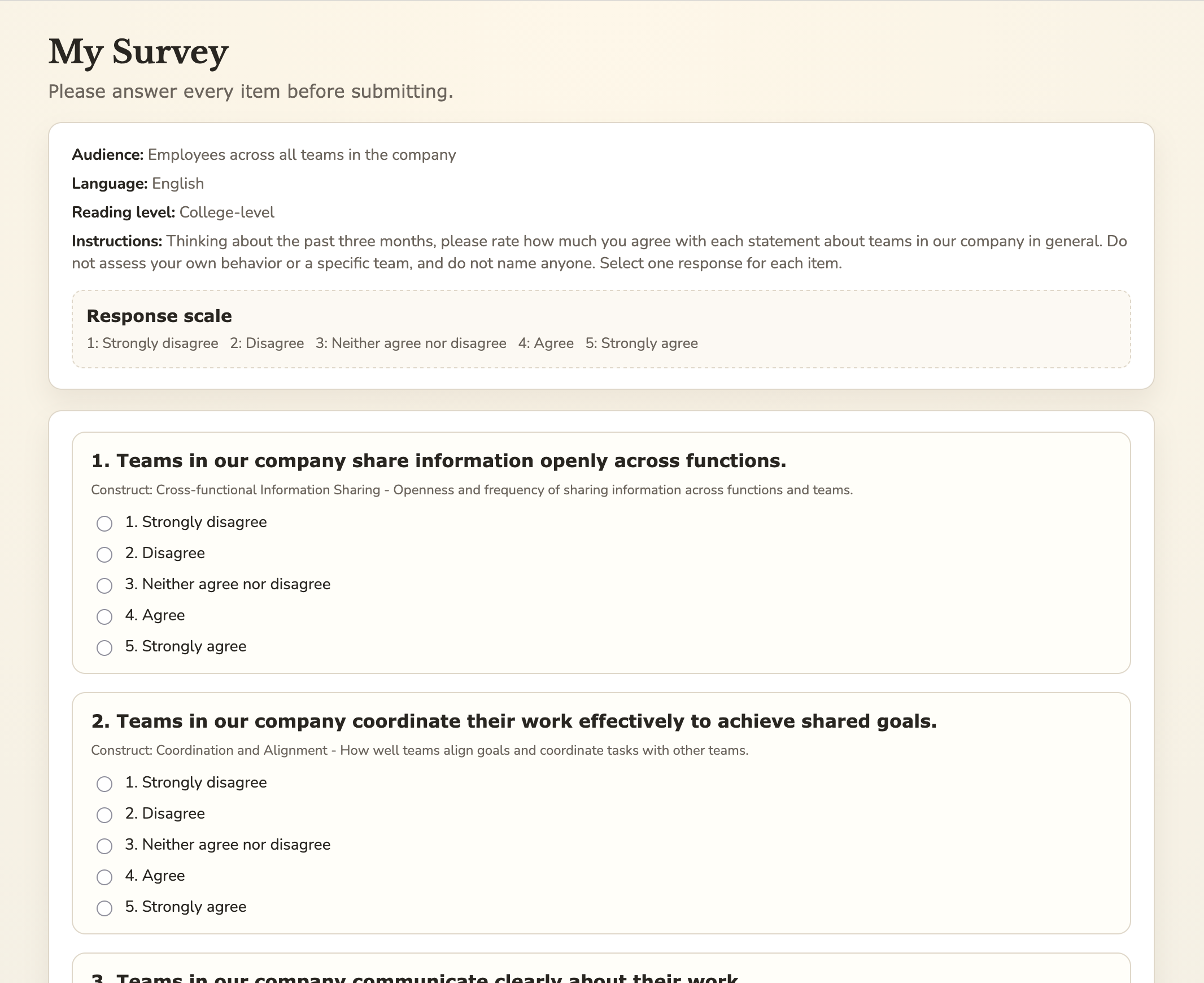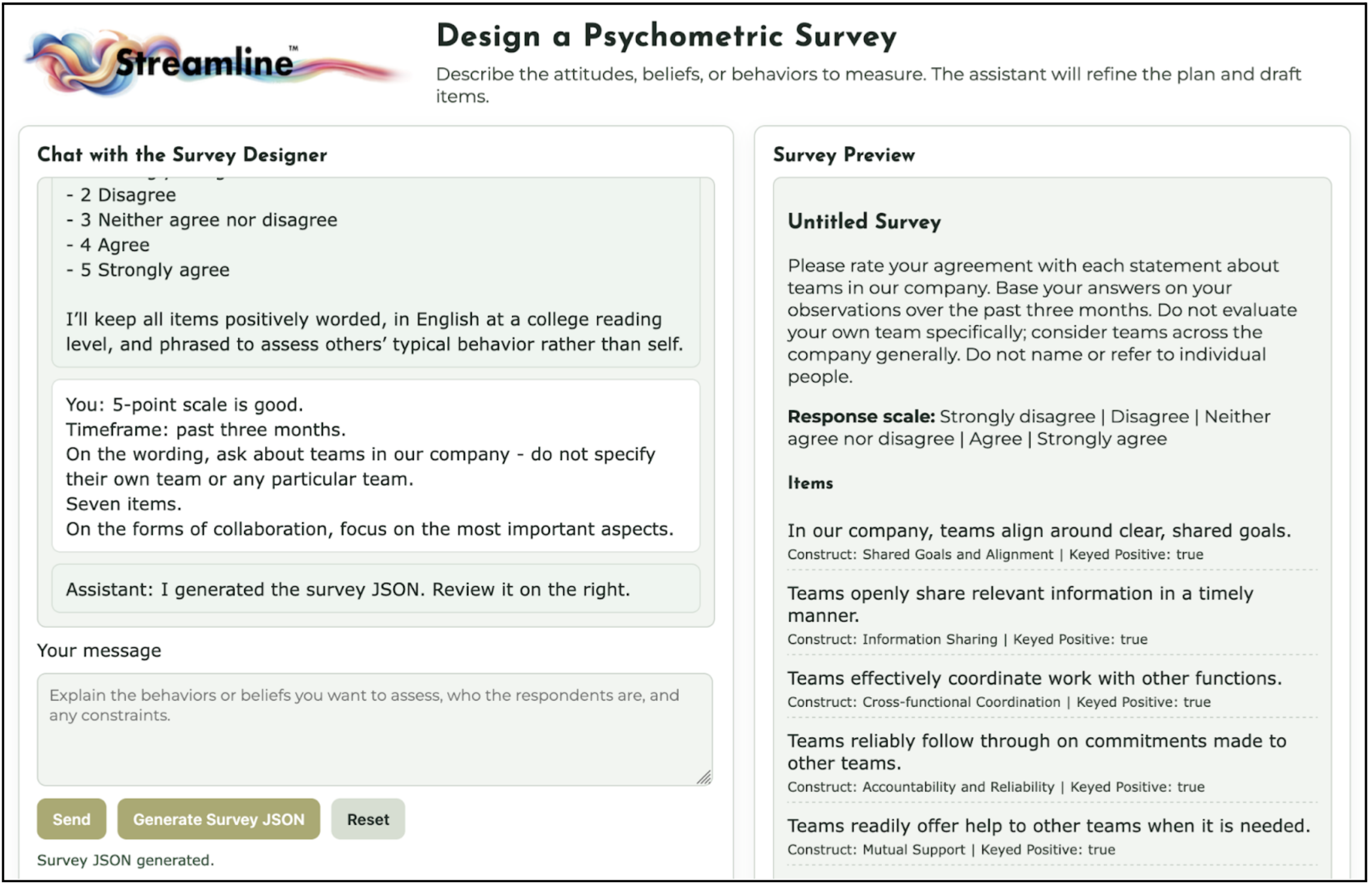 The use of an AI assistant is important here, because it enables you to have a discussion about what you are trying to measure. We are using the latest and most powerful model from OpenAI, so you receive deeply informed feedback and the generated survey questions reflect psychometric best practices.